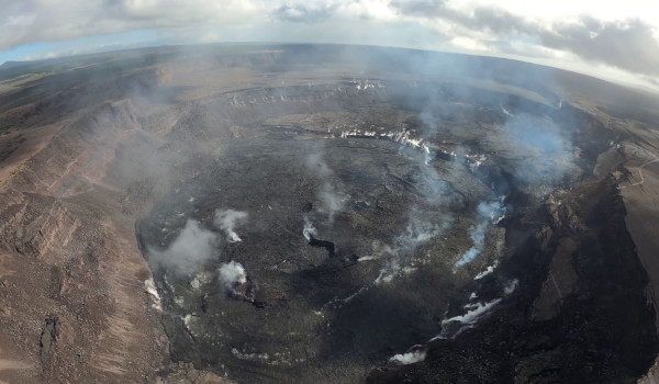 Voici ci-dessous deux photos montrant une vue d’ensemble du cratère de l’Halemaʻumaʻu. La photo du haut date du 12 décembre 2024, juste avant le début des éruptions, et celle du bas a été prise le 11 décembre 2025.