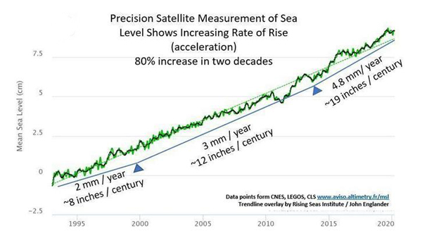 Le monde est en route vers un réchauffement climatique de 2,5 °C à 2,9 °C, ce qui rendra inévitable la disparition des calottes glaciaires du Groenland et de l’Antarctique occidental. Il est bon de rappeler que la fonte totale de ces calottes glaciaires entraînerait une élévation de 12 mètres du niveau de la mer.