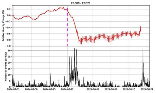This example shows how ambient noise interferometry, along with other volcano monitoring datasets, can be used to understand the changes occurring beneath the surface of a volcano. While this example focuses on changes in velocity at a single pair of nodes, future analysis will be carried out for the entire 115 instrument array. This analysis will contribute to the understanding of where magma migrated across the East Rift Zone in the time leading to the September 2024 eruption.