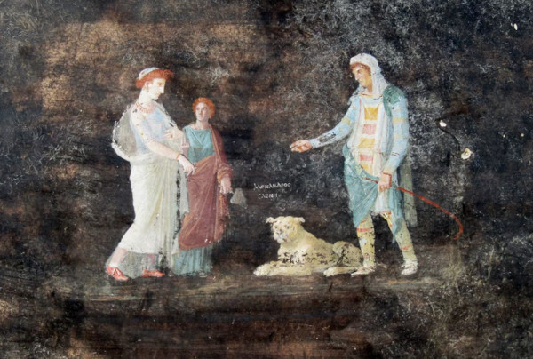 La Villa Arianna, ainsi appelée en raison de la peinture de sujets mythologiques trouvée sur le mur du fond du triclinium a été presque entièrement fouillée entre 1757 et 1762. Les décorations témoignent non seulement du haut niveau de vie qui devait y régner, mais aussi du goût extrêmement raffiné d’une clientèle de haut rang. Dans les grandes salles et les halls, les thèmes mythologiques sont principalement représentés par des figures presque grandeur nature inspirées de Dionysos, comme la peinture d’Ariane abandonnée par Thésée sur le mur du fond du triclinium, salle à manger, ainsi nommée en raison de l’utilisation de lits – kline – sur lesquels les invités s’allongeaient pour prendre leurs repas.