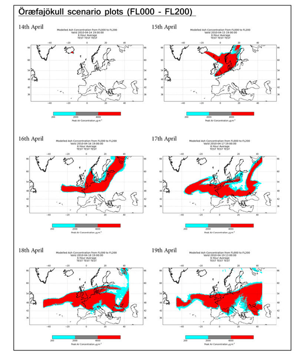 A research group at the University of Iceland has formulated two eruption scenarios for Öræfajökull based on historical events to predict possible impacts of eruptions larger than the one that occurred in Eyjafjallajökull. Both scenarios were modelled around the weather conditions from the 2010 eruption. The NAME model, an ash dispersion model used by the London Volcanic Ash Advisory Centre (VAAC), was used to simulate the ash clouds in the eruption scenarios.