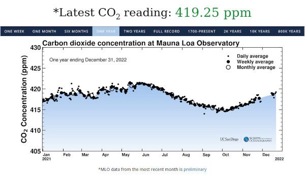 Les concentrations de dioxyde de carbone ont encore augmenté en 2022. Les mesures effectuées par l’observatoire atmosphérique de la NOAA sur le Mauna Loa à Hawaii ont culminé pour 2022 à 420,99 parties par million (ppm) en mai, soit une augmentation de 1,8 ppm par rapport à 2021. C’est une concentration qui n’a pas été observée depuis des millions d’années. . Les scientifiques de la Scripps Institution of Oceanography, qui effectue des mesures indépendantes, arrivent à une moyenne mensuelle similaire avec 420,78 ppm.