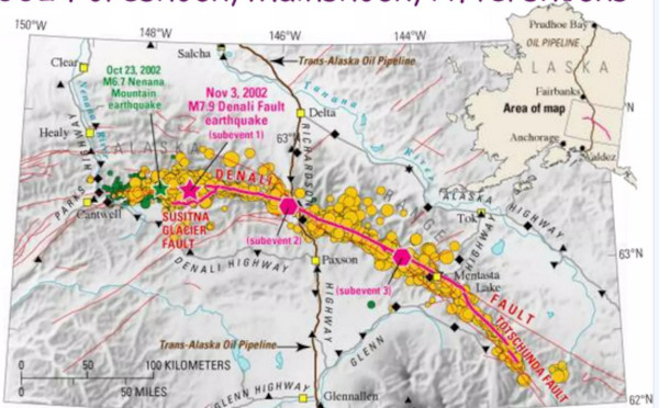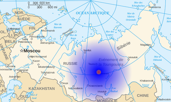 Situation et zones d’impact de la météorite de la Toungouska. Zone 1 (R=20 km) : forêt détruite (rouge) Zone 2 (R=100 km) : dégâts, brûlures, morts d’animaux (orange) Zone 3 (R=1500 km) : bruit de l’explosion (dégradé bleu) [Source: Wikipedia]