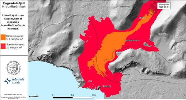 Les scientifiques islandais expliquent que la lave n’a pas encore commencé à déborder de la vallée de Meradalir, mais ce n’est qu’une question de temps. Elle se trouve actuellement au niveau d’un col – le Meradalaskarð – où elle atteint huit mètres d’épaisseur. Il suffirait d’un mètre de plus pour qu’elle déborde dans la vallée. Le 10 août 2022, les scientifiques ont estimé qu’un tel événement pourrait se produire en quelques heures, mais jusqu’à présent, le niveau de la lave a augmenté plus lentement que prévu.