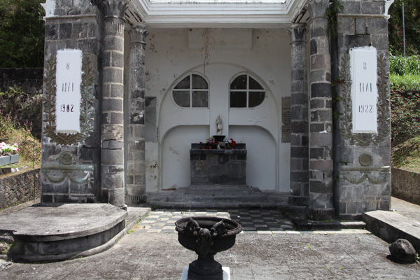 L’ossuaire de 1902 et le cimetière d’où l’on aperçoit le sommet du volcan :