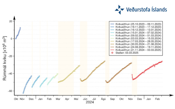 According to the latest Met Office data, magma continues to accumulate beneath Svartsengi on the Reykjanes Peninsula (Iceland). A magma intrusion or a volcanic eruption is expected in the next two to three weeks. According to the probability calculations, the total amount added since the last eruption is most likely to approach 16 million cubic meters in the coming days. Compared to previous eruptions, it takes 13 to 19 million cubic metres to start an eruption or a magma intrusion.