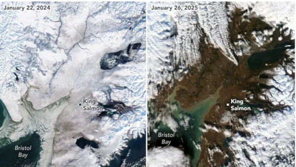 The images, taken by the Moderate Resolution Imaging Spectroradiometer (MODIS) instrument on NASA’s Terra and Aqua satellites, show Bristol Bay Borough in southern Alaska. Anchorage, which is located to the northeast, had an average January snow depth of 33 centimeters between 1998 and 2025.