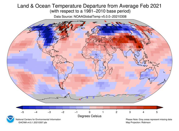 According to NASA and NOAA, the February 2021 global surface temperature was 0.65°C above the 20th century average of 12.1°C. This was the 16th highest for February in the 142-year record.