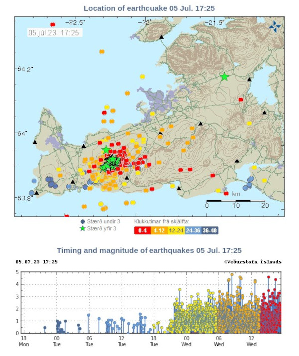 L’éruption de 2021 et celle de 2022 ont été précédées d’un soulèvement du sol et d’une forte sismicité ressentie dans le sud-ouest de l’Islande, ainsi que dans la région de la capitale. Un séisme de magnitude M 3,2 s’est produit sur la péninsule de Reykjanes, près du lac Kleifarvatn, le 28 juin 2023. Cependant, l’activité sismique a été relativement stable à Reykjanes ces derniers temps et il est difficile de dire s’il y aura une autre éruption sur la péninsule,