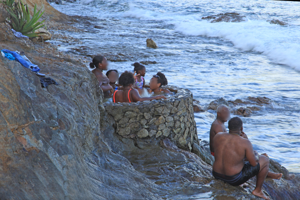 Une source thermale martiniquaise plus accessible se trouve sur le site de « Dio Ferré » aux Anses d’Arlet, petite commune du sud ouest de l’île. Plus précisément, la source se situe non loin de la plage de Petite Anse, au pied du Morne Jacqueline, un volcan éteint. L’eau proviendrait d’un réservoir dont la température serait de l’ordre de 180°C. Le site est classé patrimoine protégé. L’eau de cette source est dite miraculeuse car elle possèderait de nombreuses vertus médicinales. C’est pourquoi les riverains ont décidé de construire un petit bassin autour de la plus grande source qui avait été détruite après le passage du cyclone Dean en août 2007. Le bassin fut rénové en mai 2012 grâce à un partenariat entre la commune des Anses d’Arlet et l’Office National des Eaux et Forêts. Ce bassin, où l’eau a une température d’environ 35°C, ne peut accueillir que deux personnes au maximum. Il faut souvent attendre son tour, surtout quand les occupants, comme ce fut mon cas, se livrent à une longue séance de selfies… On profitera de l’attente pour admirer la vue imprenable sur la baie de Petite Anse.