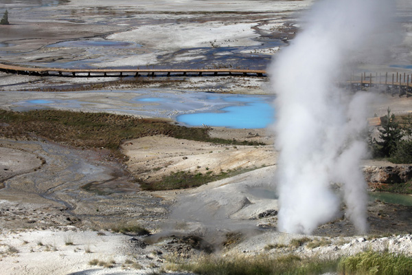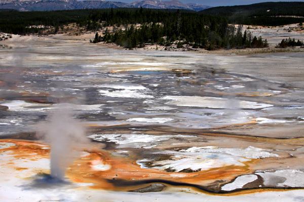 La plupart des gens qui visitent des volcans aimeraient pouvoir assister à une éruption. Pour cela, il faut se trouver au bon endroit au bon moment et beaucoup de volcans ne sont pas disposés à entrer en éruption pour faire plaisir aux touristes. En revanche, on peut observer des manifestations hydrothermales avec geysers et sources chaudes sur de nombreux sites de notre planète. Il y a quelques années, j’ai rédigé un mémoire pour le compte de L’Association Volcanologique Européenne dans lequel je vantais les qualités thérapeutiques des bains de boue sur l’île éolienne de Vulcano. L’un des endroits les plus remarquables pour admirer des geysers et des sources chaudes aux belles couleurs est incontestablement le Parc National de Yellowstone aux Etats Unis.
