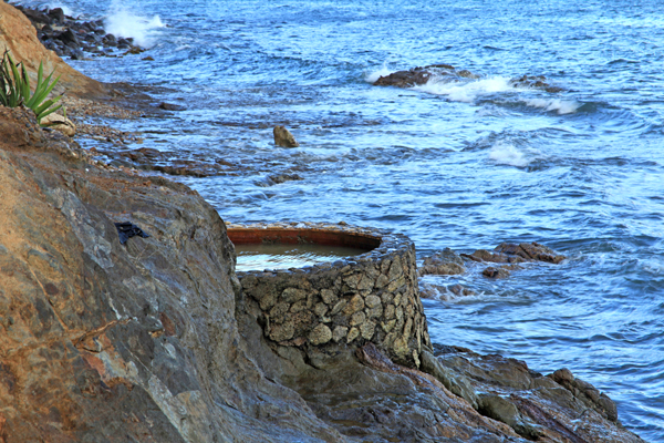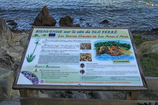 Une source thermale martiniquaise plus accessible se trouve sur le site de « Dio Ferré » aux Anses d’Arlet, petite commune du sud ouest de l’île. Plus précisément, la source se situe non loin de la plage de Petite Anse, au pied du Morne Jacqueline, un volcan éteint. L’eau proviendrait d’un réservoir dont la température serait de l’ordre de 180°C. Le site est classé patrimoine protégé. L’eau de cette source est dite miraculeuse car elle possèderait de nombreuses vertus médicinales. C’est pourquoi les riverains ont décidé de construire un petit bassin autour de la plus grande source qui avait été détruite après le passage du cyclone Dean en août 2007. Le bassin fut rénové en mai 2012 grâce à un partenariat entre la commune des Anses d’Arlet et l’Office National des Eaux et Forêts. Ce bassin, où l’eau a une température d’environ 35°C, ne peut accueillir que deux personnes au maximum. Il faut souvent attendre son tour, surtout quand les occupants, comme ce fut mon cas, se livrent à une longue séance de selfies… On profitera de l’attente pour admirer la vue imprenable sur la baie de Petite Anse.