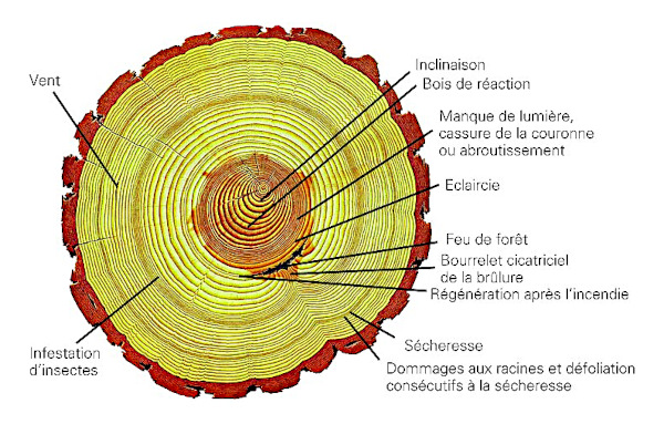 Les cernes enregistrent les événements environnementaux (Source : Institut fédéral suisse de recherches sur la forêt, la neige et le paysage)