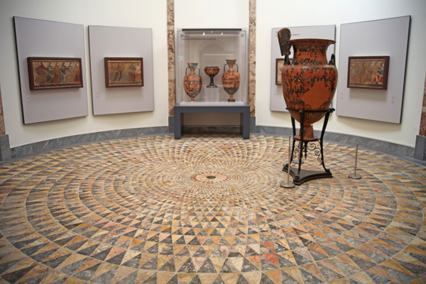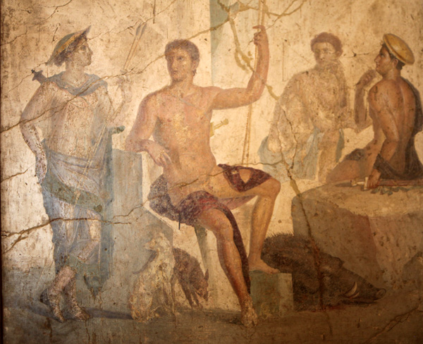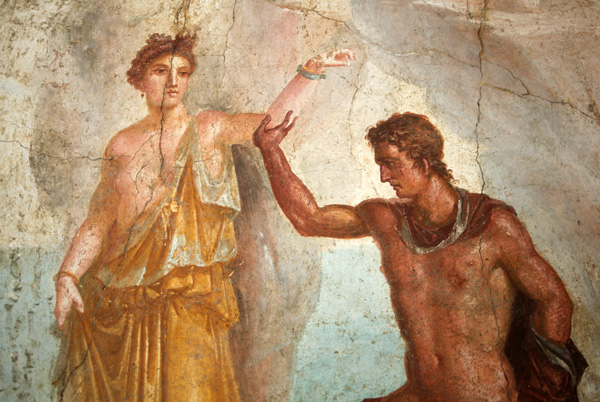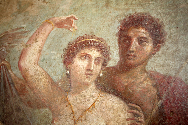 La Villa Arianna, ainsi appelée en raison de la peinture de sujets mythologiques trouvée sur le mur du fond du triclinium a été presque entièrement fouillée entre 1757 et 1762. Les décorations témoignent non seulement du haut niveau de vie qui devait y régner, mais aussi du goût extrêmement raffiné d’une clientèle de haut rang. Dans les grandes salles et les halls, les thèmes mythologiques sont principalement représentés par des figures presque grandeur nature inspirées de Dionysos, comme la peinture d’Ariane abandonnée par Thésée sur le mur du fond du triclinium, salle à manger, ainsi nommée en raison de l’utilisation de lits – kline – sur lesquels les invités s’allongeaient pour prendre leurs repas.