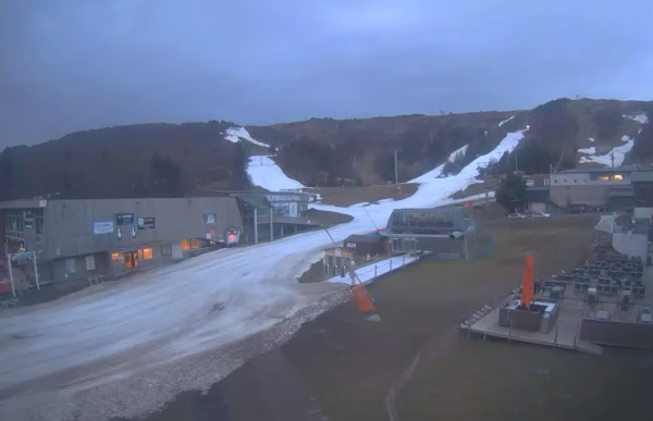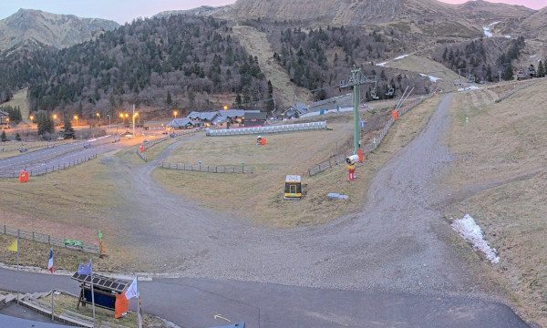 La neige a totalement abandonné la station du Mont Dore en Auvergne. A 1500m d’altitude, la température est trop douce pour que les enneigeurs puissent fonctionner (Image webcam du 2 janvier 2023)