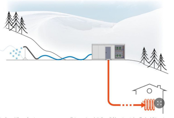Le dispositif de production de neige se présente sous la forme d’un gros congélateur qui produit d’un côté la neige et chauffe des bâtiments de l’autre. (Source: WeSnow, société qui commercialise les nouveaux enneigeurs)
