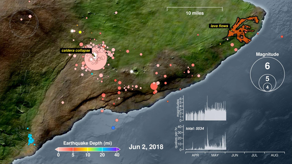 Afin de mieux illustrer l’activité sismique, l’animation comporte dans sa partie inférieure des graphiques montrant des statistiques. Le graphique du haut montre les magnitudes des séismes à mesure qu’ils se produisent. Le graphique du bas montre le nombre total de séismes par heure. Le 30 avril, la fréquence des séismes a atteint une centaine par jour, avec une magnitude supérieure à M 4,0. L’événement le plus significatif a été enregistré pendant l’après-midi du 4 mai, avec une magnitude de M 6,9. Il a généré de nombreuses répliques et un petit tsunami sans gravité. Ce même séisme a également repoussé le flanc du volcan Kilauea de 50 centimètres vers l’océan.