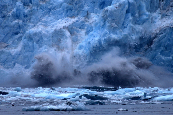 Lorsque les glaciers vêlent dans un lagon ou dans la mer, de gros blocs de glace se détachent de leurs fronts et s’effondrent en soulevant des masses d’eau ; cela donne naissance à un spectacle impressionnant et bruyant. Une distance de sécurité doit être respectée car les vagues générées par les effondrements peuvent être puissantes et sont capables de retourner des embarcations.
