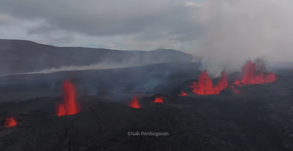 Globally, the eruption has stabilized and has far less power than during the initial phase. A few hours after the start of the eruption, the lava flow was about 100 cubic metres per second, around 1/20 of the flow at its peak in the beginning. Lava occupied an area of around 12 square kilometers. Judging from the volume of magma accumulated beneath Svartsengi, I expected a more powerful eruption, but the fissure is quite long (about 4 kilometers) which allowed more magma to pierce the surface in one go.