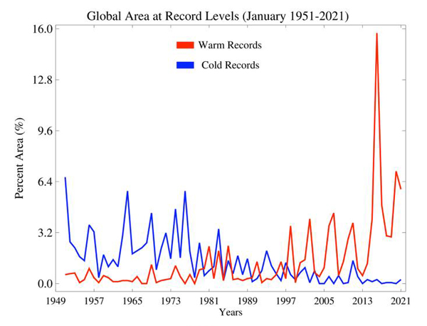 While La Niña and the sudden warming of the stratosphere have drawn attention, there is also a startling statistic. The NOAA graph below shows the percentage of the planet at an all-time high for each January since 1951 (hot in red, cold in blue). In January 2021, 5.93% of the world’s surface reached a record temperature. Only the months of January 2016 and 2020 saw higher percentages. Africa has experienced unprecedented temperatures. North America as a whole experienced its second warmest January.