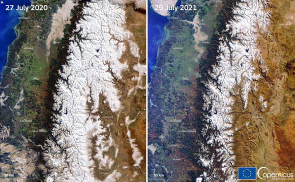 A post released on August 13th, 2021 was illustrated by two satellite images showing the lack of snow in the Andes in 2021 compared with 2020. Many peaks in the famed range, which runs along the South American continent’s western edge, have either sparse snow or totally bare ground. The current precipitation levels for the entire Cordillera Andes range show that it has either not snowed at all or has snowed very little. Because it’s winter in the Southern Hemisphere, the mountain range should be seeing peak snowfall.